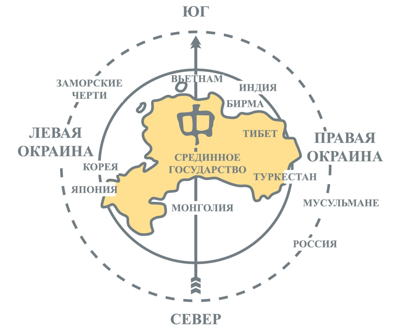 Если Китай – центр, то весь остальной мир в логике раздвоения единого будет окраиной. Именно так и воспринимают мир китайцы: чжун/вай, что по сути имеет смысл разделения на свою цивилизацию центра и чужую цивилизацию окрестности.