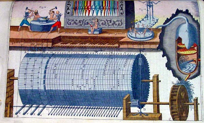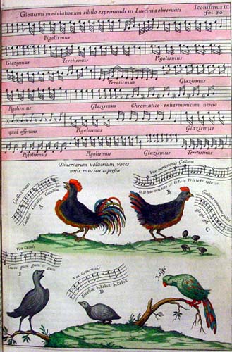 Но больше всего Кирхер запомнился жителям Рима, где он занимался преподавательской деятельностью. Он как одержимый носился с идеей создания кино. Вопреки истине во многих источниках он упоминается как создатель «волшебного фонаря» (Laterna magica). Однако, Кирхер был первым, кто использовал проектор для впечатляющих представлений, где помимо изображения в ход шли и звуковые эффекты.Г решник в аду: "волшебный фонарь" Атанасиуса Кирхера в действии Кирхер известен своими опередившими время работами в области акустики, где им разрабатывалась волновая теория звука. Он разработал акустический усилитель и выдвигал идею создания цветомузыкальных инструментов, а также был автором известной «Теории аффекта» о специфическом воздействии музыки на эмоции и психику человека. Он же, очевидно, первым из европейцев пришел к идее программируемого музыкального инструмента. Из книги Атанасиуса Кирхера "Musorgia universalis"В своей книге “Musorgia universalis” (Всеобщая музыкальная стихия), изданной в 1662 году, он пишет, что построил специальную машину, с помощью которой можно получить нотную запись песен соловья. Что из этого вышло, неизвестно, но нотную запись голосов курицы, петуха, кукушки и перепела он приводит. Вряд ли Кирхер подозревал, что через неполных триста лет граммофон сделает его машину ненужной. Из книги Кирхера "Musorgia universalis"Из других музыкальный причуд Кирхера можно выделить "Кошачье пианино", в котором вместо механической части использованы живые коты. Да, да, не удивляйтесь, во времена Кирхера считалось, что мяуканье котов может лечить от меланхолии. На тему кошачьего пианино даже выпущен короткометражный мультфильм «The Cat Piano», в котором рассказывается история города кошек, где музыкантов похищает человек, чтобы сделать кошачье пианино