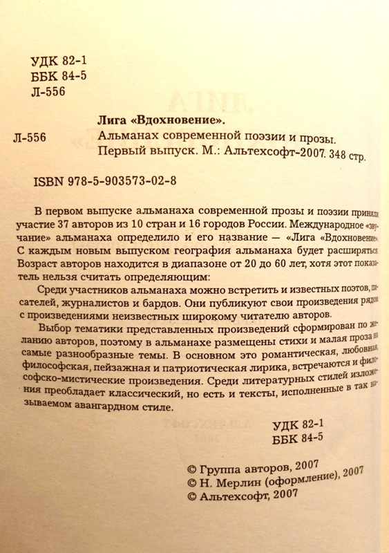 ЛИГА «ВДОХНОВЕНИЕ» Альманах современной поэзии и прозы. 1-ый выпуск. АЛьтехсофт, 2007, с.116-123 https://yadi.sk/i/K6fff4s1fVGhg