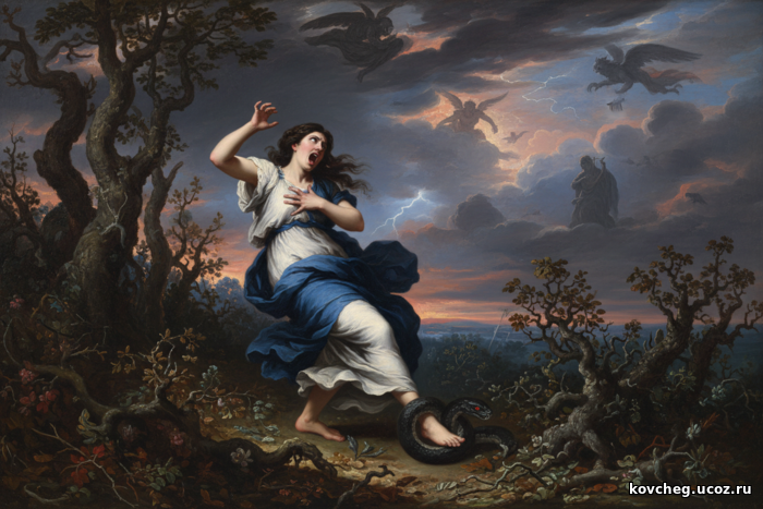 Змея обвилась вкруг ноги Эвридики, Она закричала, но поздно… укус Смертельным был! (он порождает искус Поддаться земным наваждениям, крикам).