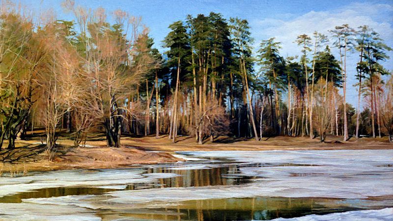 Солнечно, мартовским утром, среда… Белое золото, розовый иней Сердце грустит по берёзовой стыни, Там, где в колодцах звенела вода…