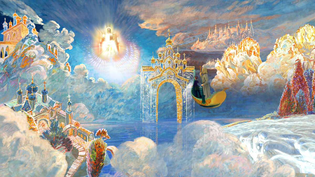 Спасенный Фауст, Немного просветленный, Пока усталый и несчастный, Упорно следует за ней. Теперь ему почти не страшно. Жалея и любя, Она ведет его учиться.
