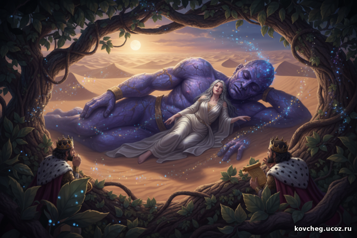 Чрез потайную дверь покинули покои И долго странствовали дни они и ночи, Достигли Древа, где ручей вливался в море… Пленяя дивной красотою царски очи…