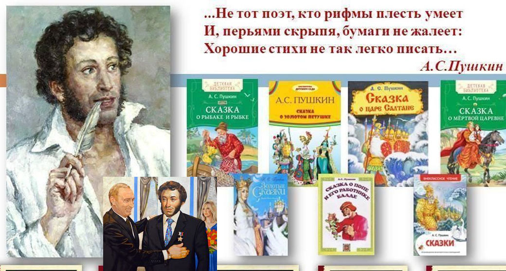 Но вернёмся к Пушкину. Я вообще-то пошутил над картиной художника, который облачил Пушкина в белую рубашку с голубым галстуком (цвета израильского флага), ВВП сделал рыжим, фон у картины тоже бело-голубой. Пушкин действительно Герой России, но посмертно. А картину как назвать: кощунство, гротеск, шутка или политическая сатира? Моё предложение - остановимся на шутке.