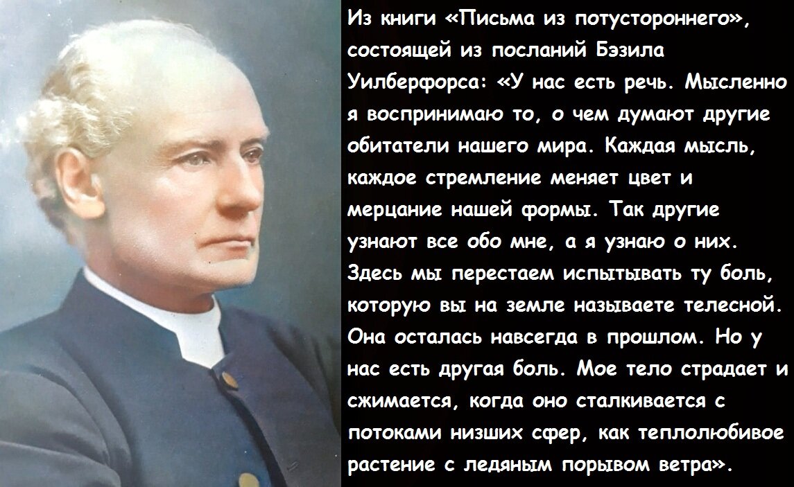В более поздних сообщениях Уилберфорс рассказал о том, насколько ярки его воспоминания о тех местах на земле, в которых он жил. Уилберфорс заметил, что чем больше он находится в невидимом мире, тем все менее отчетливыми в его памяти становятся земные пейзажи. Они постепенно исчезают из ума и памяти.Среди вопросов, на которые ответил Уилберфорс в своих письмах, был вопрос и о том, где пребывает душа человека до земного рождения?– Это вопрос опыта. А такого опыта у меня пока нет. Насколько мне известно, я никогда раньше не жил на земле. Но я уверен, что знал и любил другие души. Где это было и когда, пока я не могу вспомнить, – отвечал Уилберфорс.