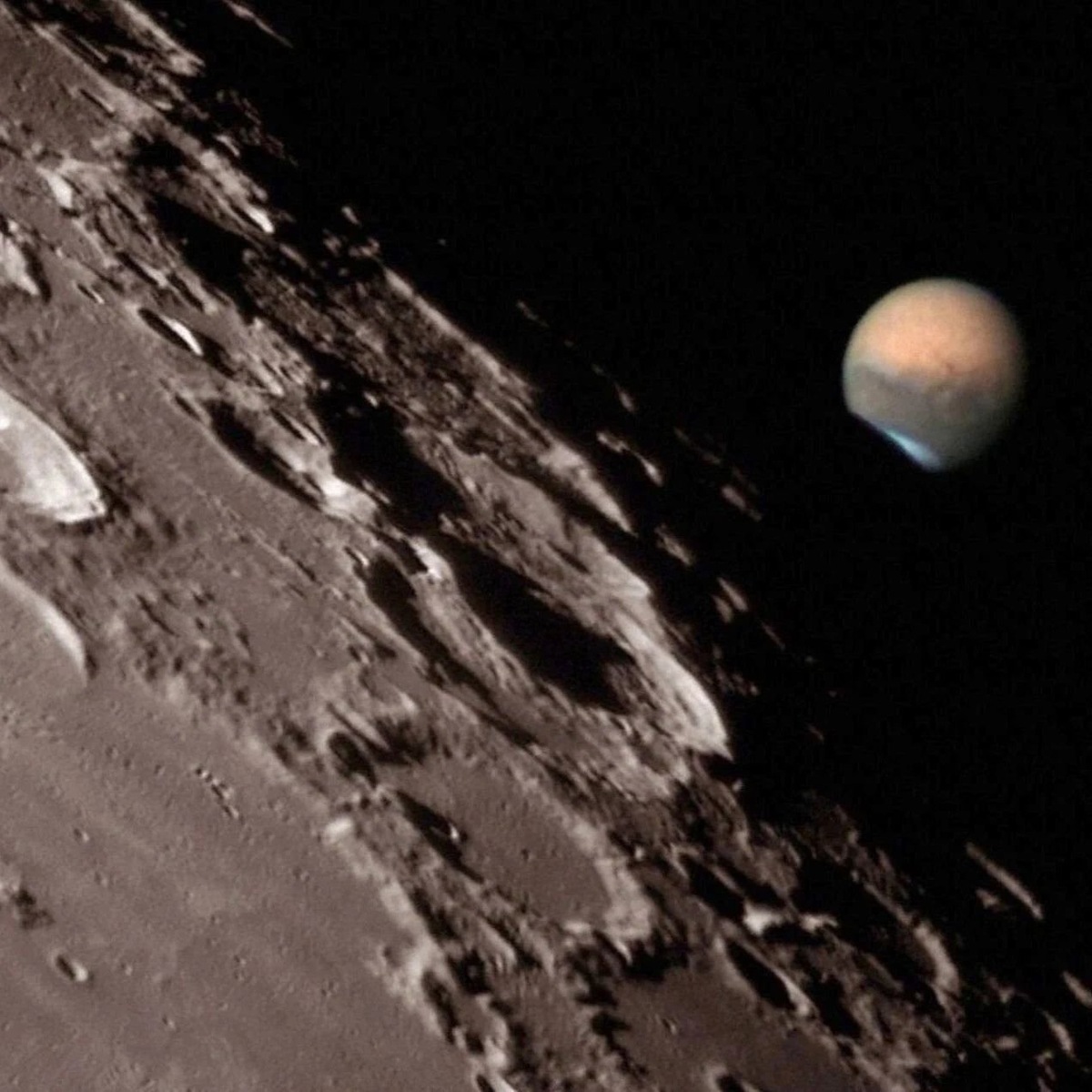 Луна и Марс на одной фотографииЭта зрелищная фотография была сделана с Земли в 340 миллиметровый телескоп. В одном кадре одновременно оказались Луна и Марс. В момент фотографии Луна и Марс находились в планетарном сближении.На снимке детально можно рассмотреть неровную поверхность Луны, испещренную ударными кратерами. На горизонте виднеется Марс, а также видна его полярная ледяная шапка (Северный полюс на Красной планете). Расстояние от Земли до Луны составляет приблизительно 380 000 километров. А наименьшее расстояние от Земли до Марса учёные установили в 55 000 000 миллионов километров.