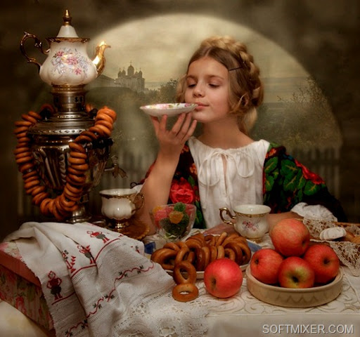 Если говорить о сложившейся традиции русского чаепития, то можно выделить некий лубочный образ, усреднённый «бренд» чая по-русски: это самовар, пузатый чайник-заварник, фарфоровые чашки на блюдцах, кусковой сахар и чайные угощения: блины, пироги, ватрушки, баранки и прочие сладкие и не очень «закуски». Этот купеческо-мещанский способ питья чая и стал считаться русским, так как дворянское чаепитие с его копированием английских традиций не может считаться русским.