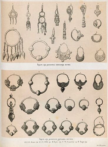 Сверху — серьги из раскопок скифских могил; снизу — серьги из раскопок русских могил.