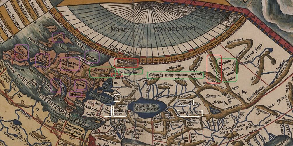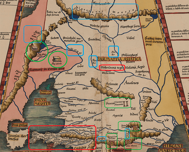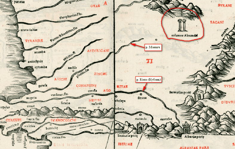 Интересно, что хотя данная страница посвящена уже Азиатской Сарматии, автор все-таки решил повторно продублировать здесь вышеописанные достопримечательности — Allexandri Are и Are Ces(f)aris, относящиеся к Европейской Сарматии — настолько они важны. К ним добавляются еще несколько новых: колонны Александра (см. зеленым) и целый ряд ворот в Кавказских горах (см. на карте выше в зеленых рамках).