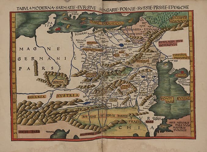 Заметим, что граница с запада четко проходит по реке Одра, за которой расположена Германия Магна. То есть именно здесь заканчивались исторические владения сарматов и начинались земли других племен.Интересно еще название Russia: помимо Белой Руси (она же Московия) оно указано на карте еще дважды (см. ниже рамки красного цвета).Читаемых названий мало — узнаются Гродно, Полоцк, Рига, Смоленск, Москва. Москва стоит практически на Рипейских горах, очертание которых никак не изменено по сравнению с древними картами Птолемея, хотя за столько столетий, казалось, можно было бы разобраться где находятся Уральские горы (либо Северные Увалы).