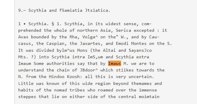 Границей разделения между нами, очевидно, служат какие-то горы — montes, что зафиксировано в самом их обозначении. Если смотреть на карту, то эти самые горы-граница — это нечто под названием Imausmens (красный). Пробуем найти это слово с помощью поисковых систем и попадаем на англоязычный учебник античной географии авторства H. I. SCHMIDT, D. D. Там как раз есть важный абзац про границы Скифии: