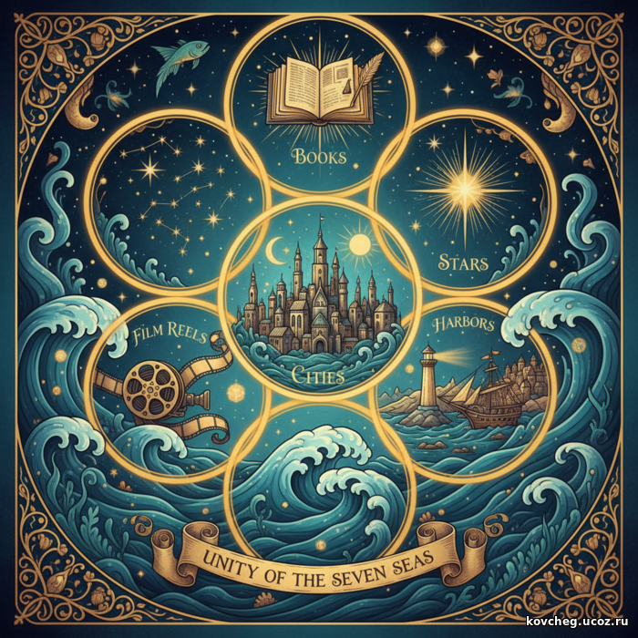 Моря (Соломона, Пифагора, Руми, Вечности, Сказок, Суфия, Ницше): символы - свиток Соломона, геометрия Пифагора, поэтическая книга Руми, песочные часы Вечности, волшебный свиток Сказок, суфийский дервиш, молния Ницше.